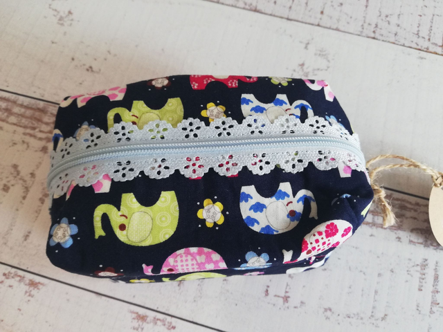 Small little case perfect for travel, storing cables or other little items in to prevent them getting lost! In an adorable elephant print with a lace effect exposed zip. As each of these bags are handmade, there may be slight variances between each bag. Case is13cm long, 6cm wide and 6cm deep.
