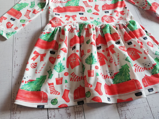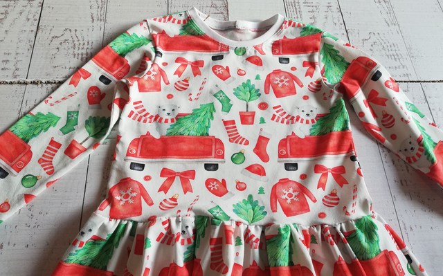 These lovely children's dresses have a gathered skirt to show off the nice festive print! They feature a great festive print featuring polar bears in trucks, with Christmas trees, jumpers and candy canes! They are made using lovely soft stretchy fabric for a great fit and comfort, and have long sleeves so are perfect keeping warmer in the colder months! If you are looking for a different size, please contact me and I can made to order. As each of these items are handmade, sizes may vary ever so slightly.