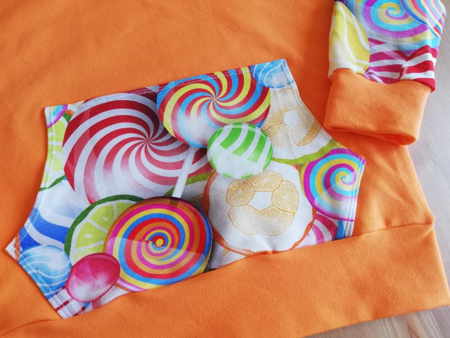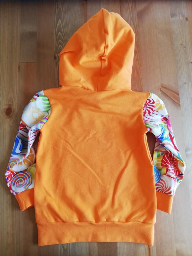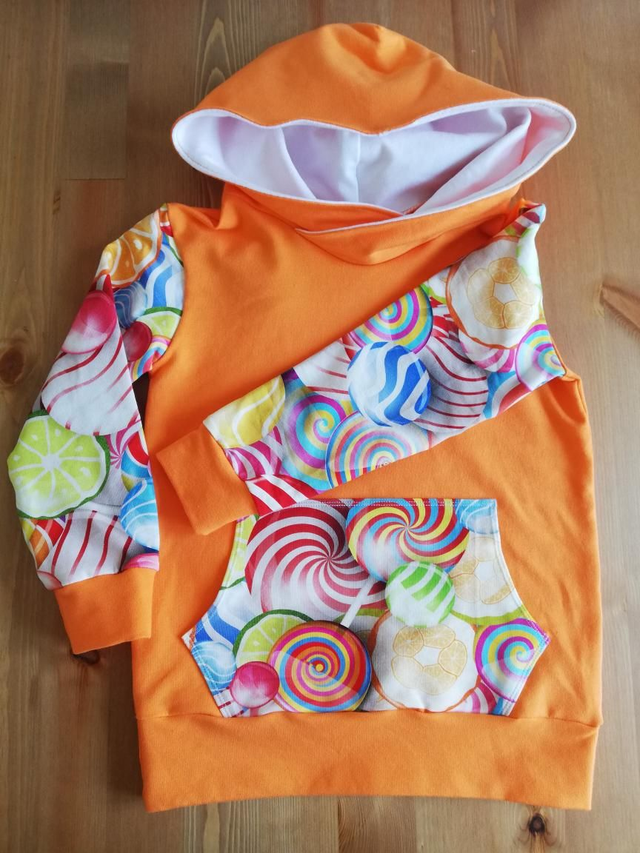 Know a young someone with a sweet tooth? How about one of these gorgeous, snugly hoodies with sweets and lollipop print on the sleeves and kangaroo pocket! These are created from a french terry fabric, giving a lovely stretch and some warmth, but not too warm so can be used year round! The main body of the hoodies are made from orange, with white lining the hoods. As each of these items are handmade, the lollipop and sweet print may vary slightly from photographs and the sizes may vary ever so slightly. 3-4yrs 26" chest, 11.5" sleeve, 17" back (from neck to bottom hem) 5-6yrs 30" chest, 12.5" sleeve, 19" back (from neck to bottom hem)