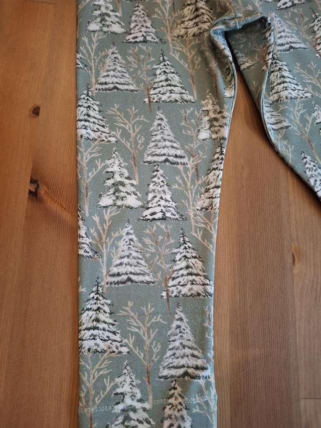 These fantastic fit stretch leggings feature winter snowy trees on a pale green background. Perfect for all the colder seasons, not just Christmas! The trim fit of these leggings will also have room for disposable nappies or underwear. Age 1 and up are hemmed at the ankle and age below 1 year have cuffs for extra growing room and an easier fit. As each of these items are handmade, sizes may vary ever so slightly. If you want a different size or colour, let me know and I can make to order.