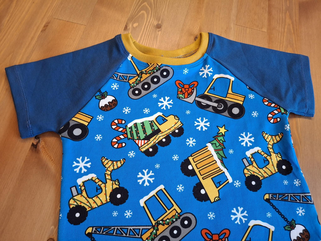 A brilliant raglan style t-shirt that your child will love! The main body of the t-shirt is a really fun print featuring diggers and trucks decked out for the festive season! The sleeves of the t-shirt and neckband are colour coordinated in blue and yellow. The t-shirts are made from a lovely soft and stretchy cotton, meaning your little one will be nice and comfy. As each of these items are handmade, sizes may vary ever so slightly. If you are looking for a different size, please contact me and I can make to order.