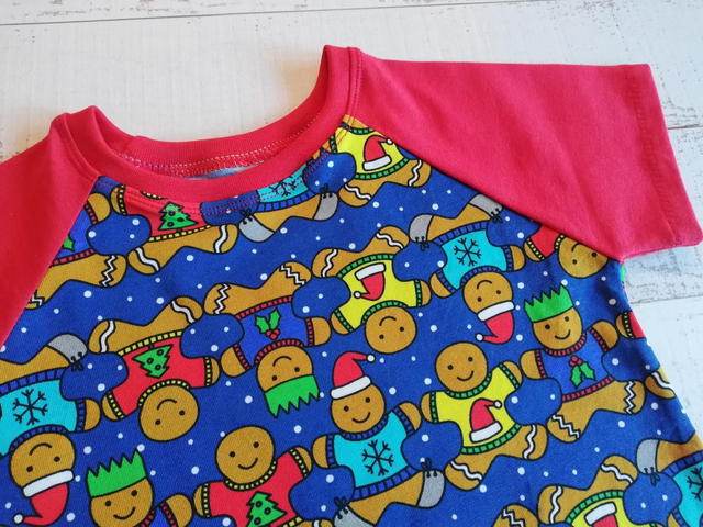 A brilliant festive raglan style t-shirt that your child will love! The main body of the t-shirt is blue with snow falling and gingerbread men chains across it! The gingerbread men are all ready for the big day, with their party hats, Christmas jumpers and Santa hats! The sleeves of the t-shirt and neckband are colour coordinated in red. The t-shirts are made from a lovely soft and stretchy cotton, meaning your little one will be nice and comfy. As each of these items are handmade, sizes may vary ever so slightly. If you are looking for a different size, different sleeve colour or length, please contact me and I can make to order.
