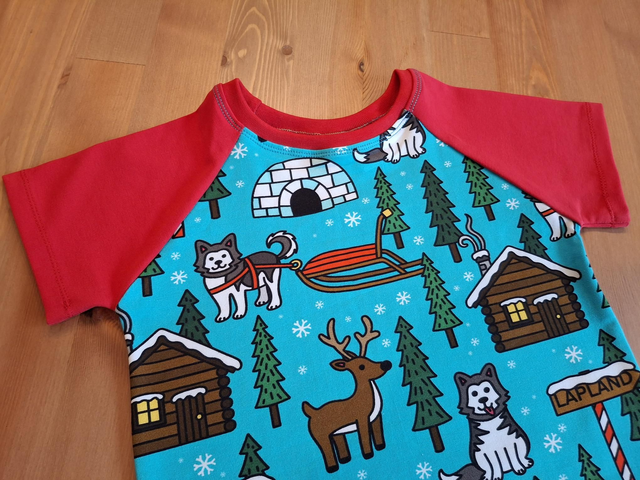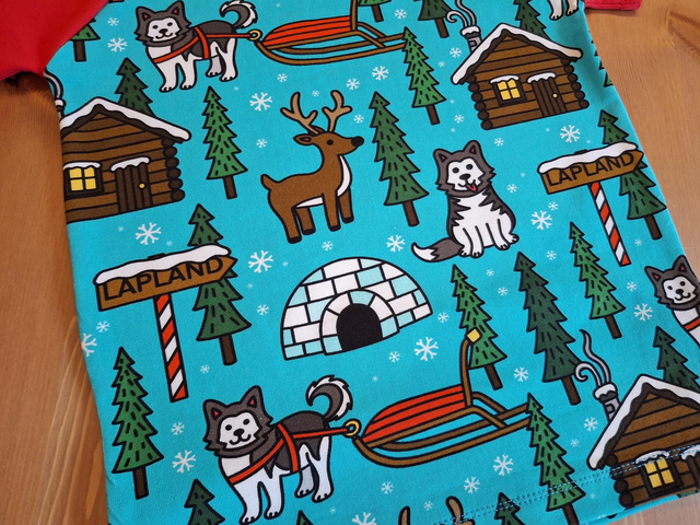 A brilliant raglan style t-shirt that your child will love! The main body of the t-shirt is a lovely print featuring husky dogs and signs to Lapland! The sleeves of the t-shirt and neckband are colour coordinated in red. The t-shirts are made from a lovely soft and stretchy cotton, meaning your little one will be nice and comfy. As each of these items are handmade, sizes may vary ever so slightly. If you are looking for a different size, please contact me and I can make to order.