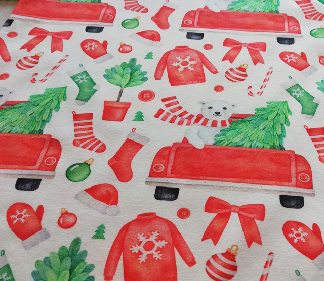 A brilliant festive raglan style t-shirt that your child will love! The main body of the t-shirt is white with a lovely festive print featuring polar bears in trucks, with Christmas trees, jumpers and candy canes! The sleeves of the t-shirt and neckband are colour coordinated in green and white. The t-shirts are made from a lovely soft and stretchy cotton, meaning your little one will be nice and comfy. As each of these items are handmade, sizes may vary ever so slightly. If you are looking for a different size, different sleeve colour or length, please contact me and I can make to order.
