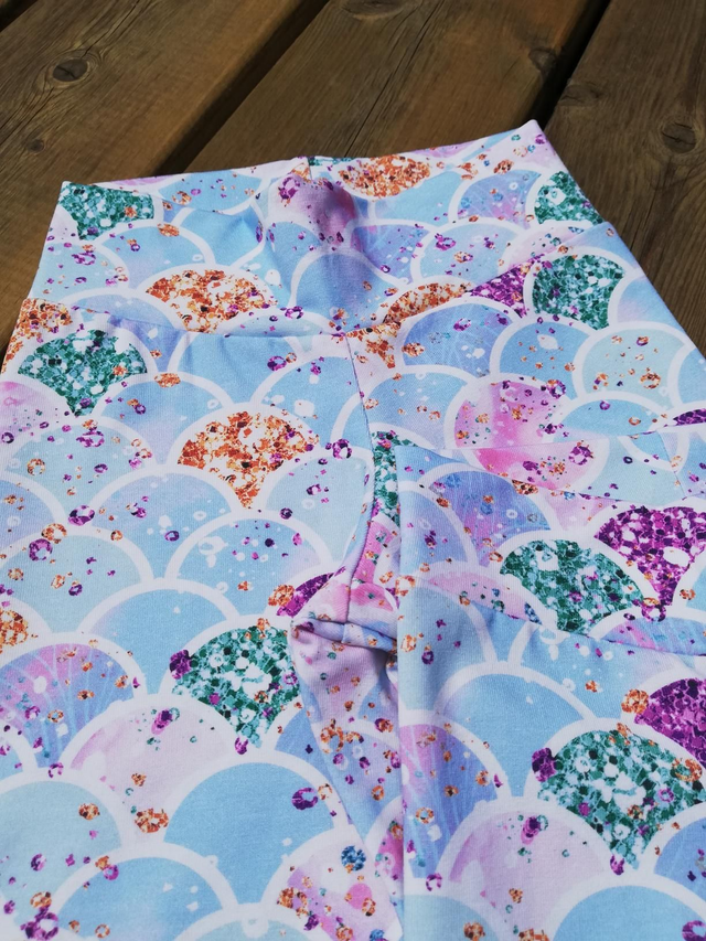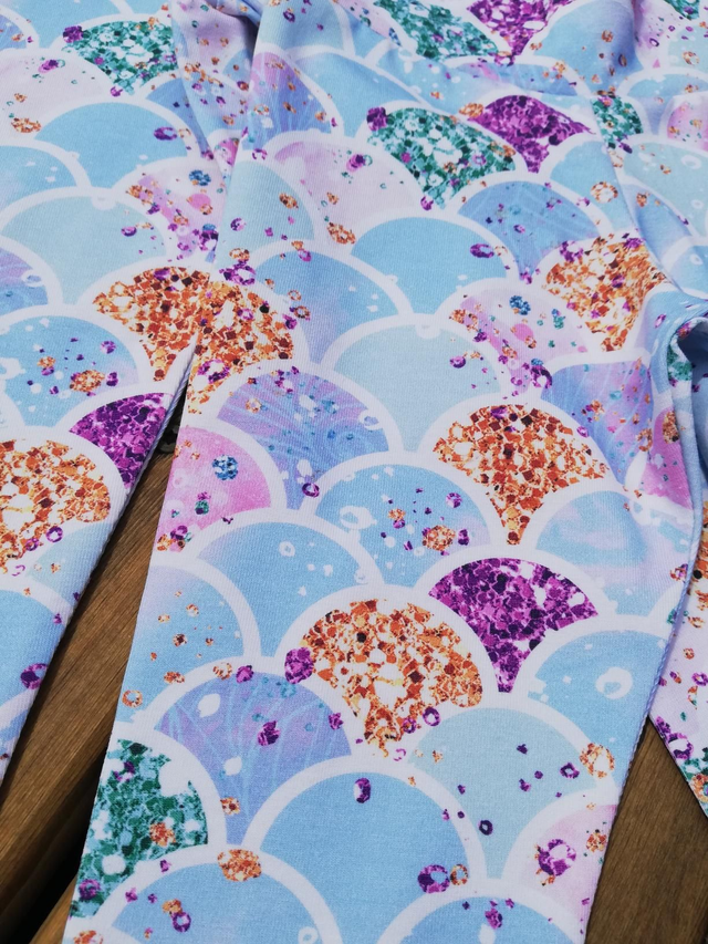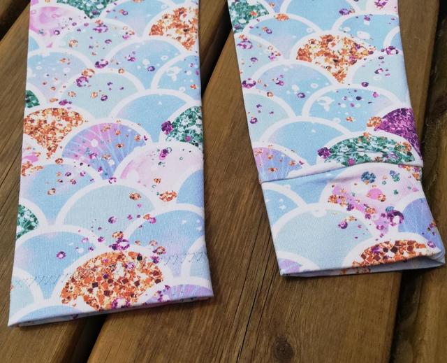 Beautiful slim fit stretch leggings perfect for the active child in a fantastic mermaid scale print. The leggings have a stretchy waistband for comfort and are perfect for the little mermaid lover in your life! Age 1-2 yrs and up are hemmed at the ankle and age 1 yr and below have cuffs for extra growing room and an easier fit. The slim and trim fit of these leggings will also have room for disposable nappies or underwear. As each of these items are handmade, sizes may vary ever so slightly.