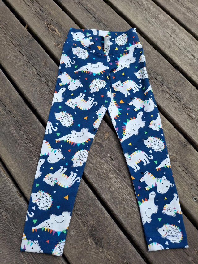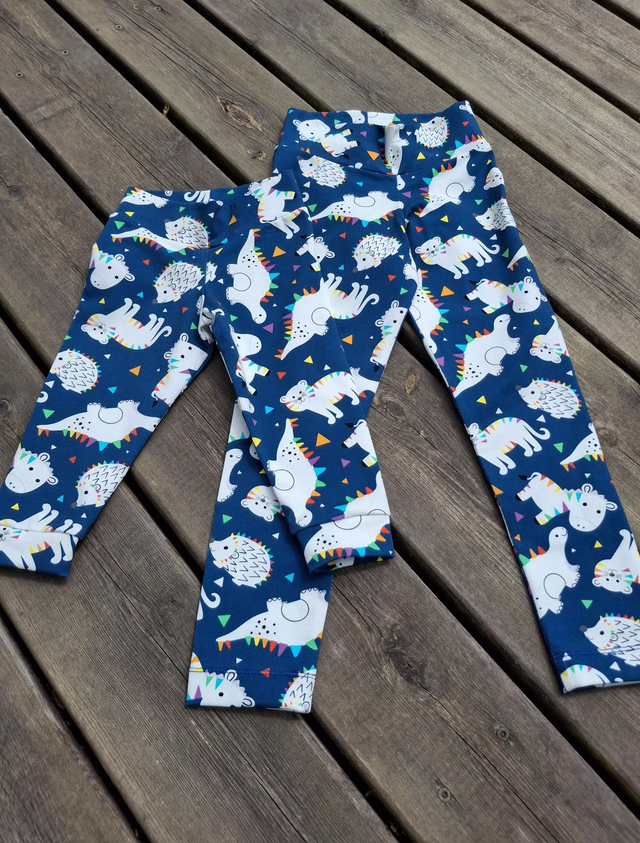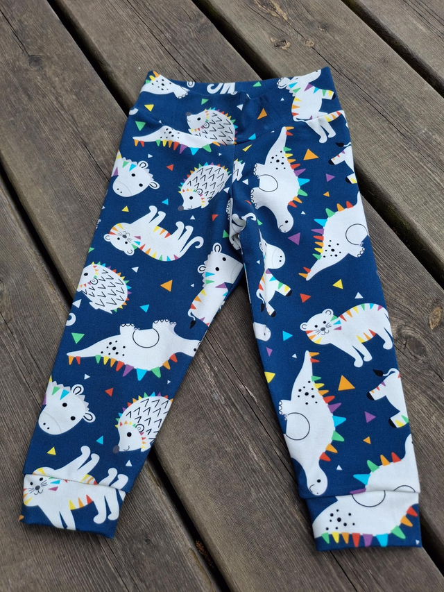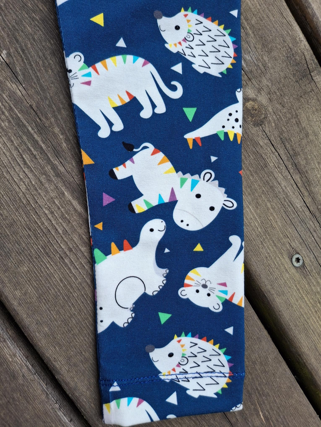 These fantastic slim fit stretch leggings feature cream animals with rainbow highlights on a navy background. Dinosaurs, cats and hedgehogs all have a home on these leggings! The leggings have a stretchy waistband for comfort and are perfect for the active child! The slim and trim fit of these leggings will also have room for disposable nappies or underwear. Age 1 and up are hemmed at the ankle and age below 1 year have cuffs for extra growing room and an easier fit. As each of these items are handmade, sizes may vary ever so slightly. If you want a different size or colour, let me know and I can make to order.