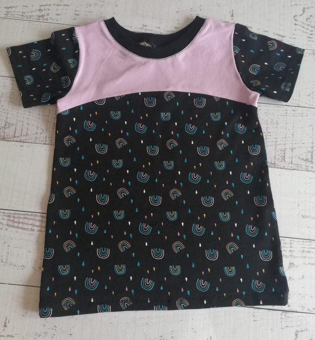 This lovely set includes a colour blocked t-shirt featuring colorful rainbows and raindrops on a black background with lilac patches to match and a pair of slim fit stretch leggings in the same lilac. The leggings have a stretchy waistband for comfort and have space for a disposable nappy or underwear. As each of these items are handmade, sizes may vary ever so slightly.