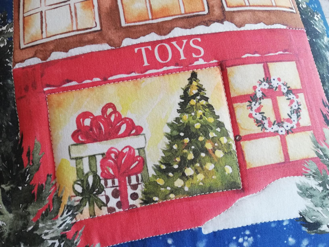 A lovely, quilted cushion with an image of a toy shop at Christmas. The cushion is approx. 14inch square and has a zip closure for easy removal of the inner for washing, as well as a colour coordinated back. As each of these items are handmade, measurements may vary ever so slightly.