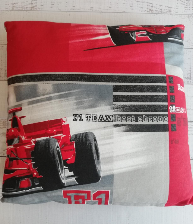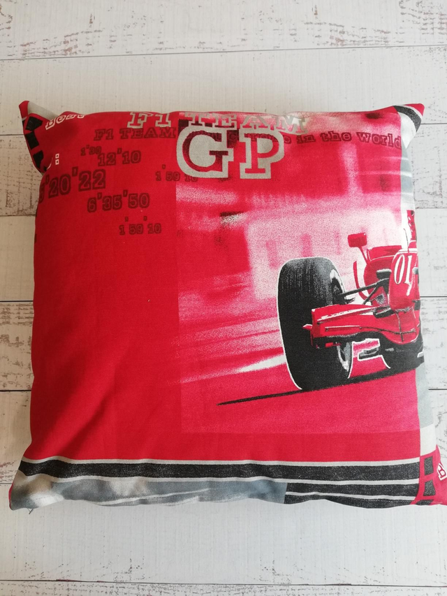 The 15" cushion is mainly red and has one car to the right and the words F1 team GP at the top. The 16" is both red and grey with a car at the left hand side. As each of these items are handmade, sizes may vary ever so slightly.