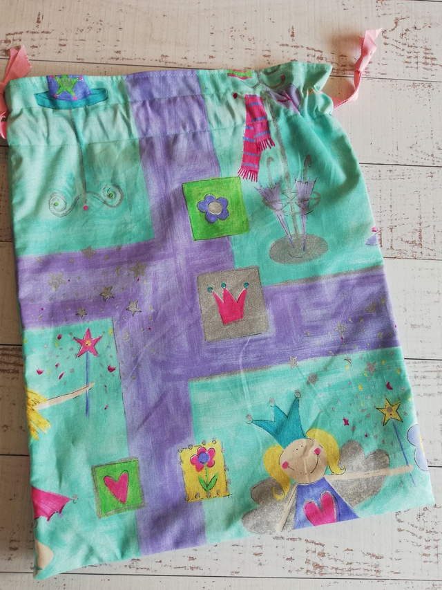 As each of these bags are handmade, there may be slight variances between each drawstring bag. Ribbon colour may vary and all sizes are approximate. 32cm wide and 41cm tall. The drawstring is approx. 35cm from the bottom of the bag.