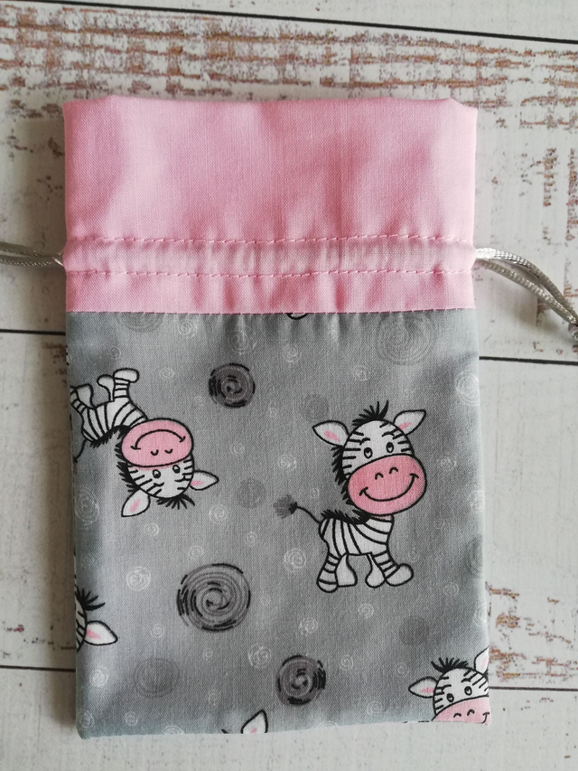 Zebra with pink top - 11cm wide, 16.5cm tall, drawstring is 11.5cm from the bottom