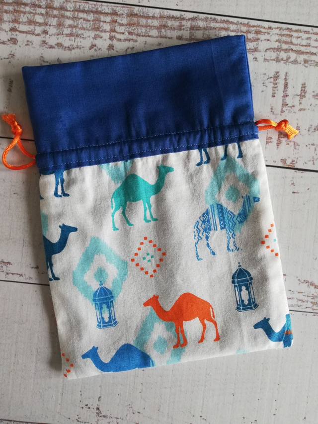 Camel with blue top - 14cm wide,19cm tall, drawstring is 12.5cm from the bottom