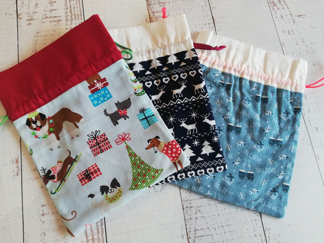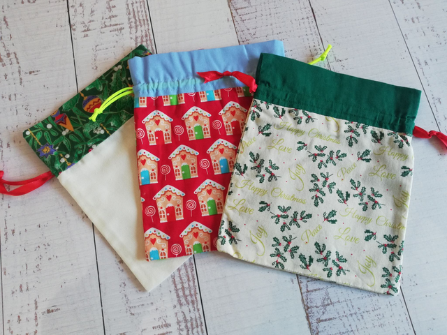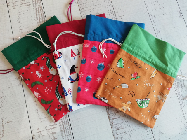 These gift bags are a perfect reusable way to wrap Christmas gifts for friends and family. Each gift bag is made from two different complementary fabrics, is lined and can be closed using the ribbon or cord drawstring. Once the gift has been opened, the gift bag can be reused as another gift bag or for other storage around the home or when on your travels.