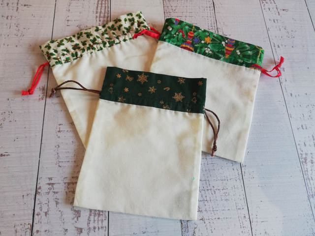 These gift bags are a perfect reusable way to wrap Christmas gifts for friends and family. Each gift bag is made from two different complementary fabrics and can be closed using the ribbon or cord drawstring. Once the gift has been opened, the gift bag can be reused as another gift bag or for other storage around the home or when on your travels.